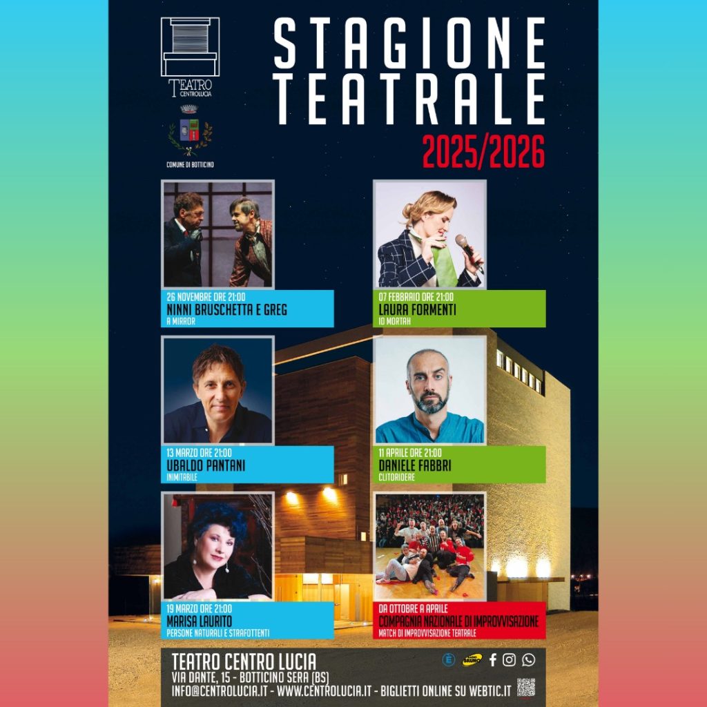 Una stagione all’insegna della comicità, della risata che si fa intelligente e dona qualcosa su cui riflettere quando cala il sipario. Sta per iniziare la stagione 2025/2026 del Teatro Centro Lucia di Botticino: cinque gli appuntamenti principali tra prosa e stand up comedy, accompagnati dalla rassegna dei “Match di improvvisazione teatrale”, format ormai consolidato che ogni mese porta sul palco la Compagnia Nazionale di Improvvisazione.