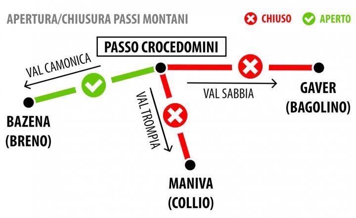 Il tratto interessato attraversa i territori comunali di Collio Valtrompia e Bagolino. Rimane invece ancora aperta per alcuni giorni la strada che, sul versante camuno, collega il Rifugio Bazena al passo Crocedomini.