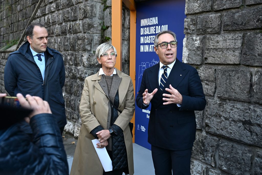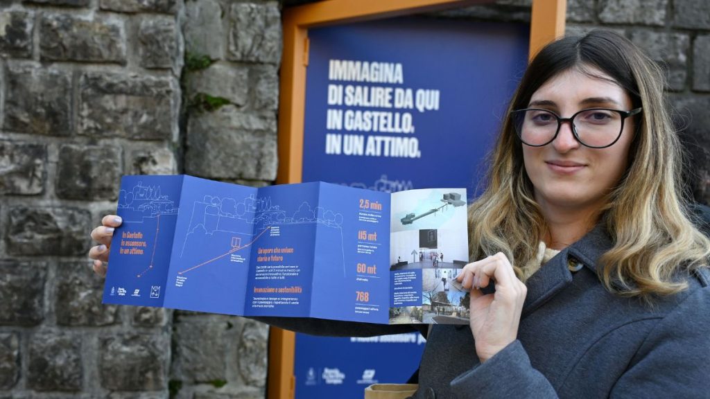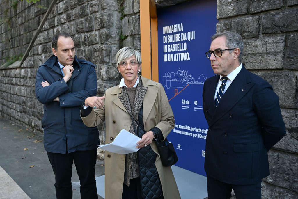 Nell’attesa, proprio nei pressi dell’ingresso alla futura stazione a valle, è stato istallato un pannello che invita cittadini, turisti, passanti a immaginare di salire in Castello in un attimo, ovvero nei soli 2 minuti e mezzo che l’ascensore impiegherà ad accompagnare 40 persone per corsa lungo i 115 metri del tracciato.