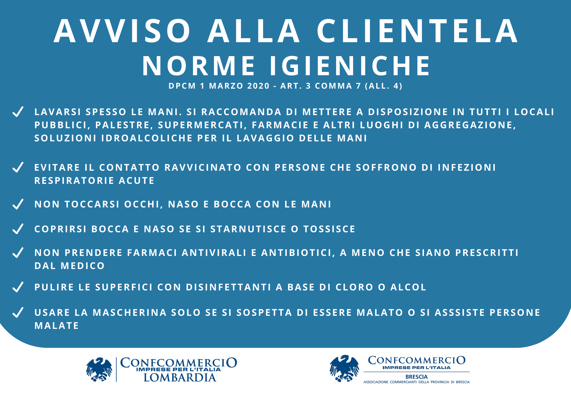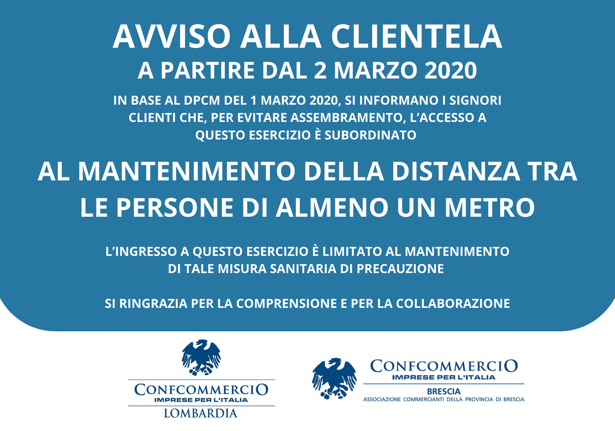 Confcommercio ha messo a disposizione le locandine informative da apporre  nei negozi per informare correttamente i propri clienti circa la “regola” ad entrare nell’esercizio commerciale rispettando la “distanza di sicurezza” e le “buone pratiche” da mettere in atto per evitare il contagio