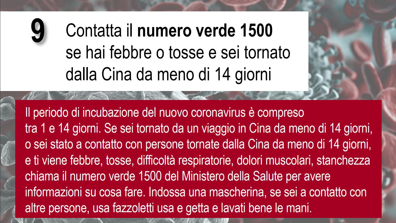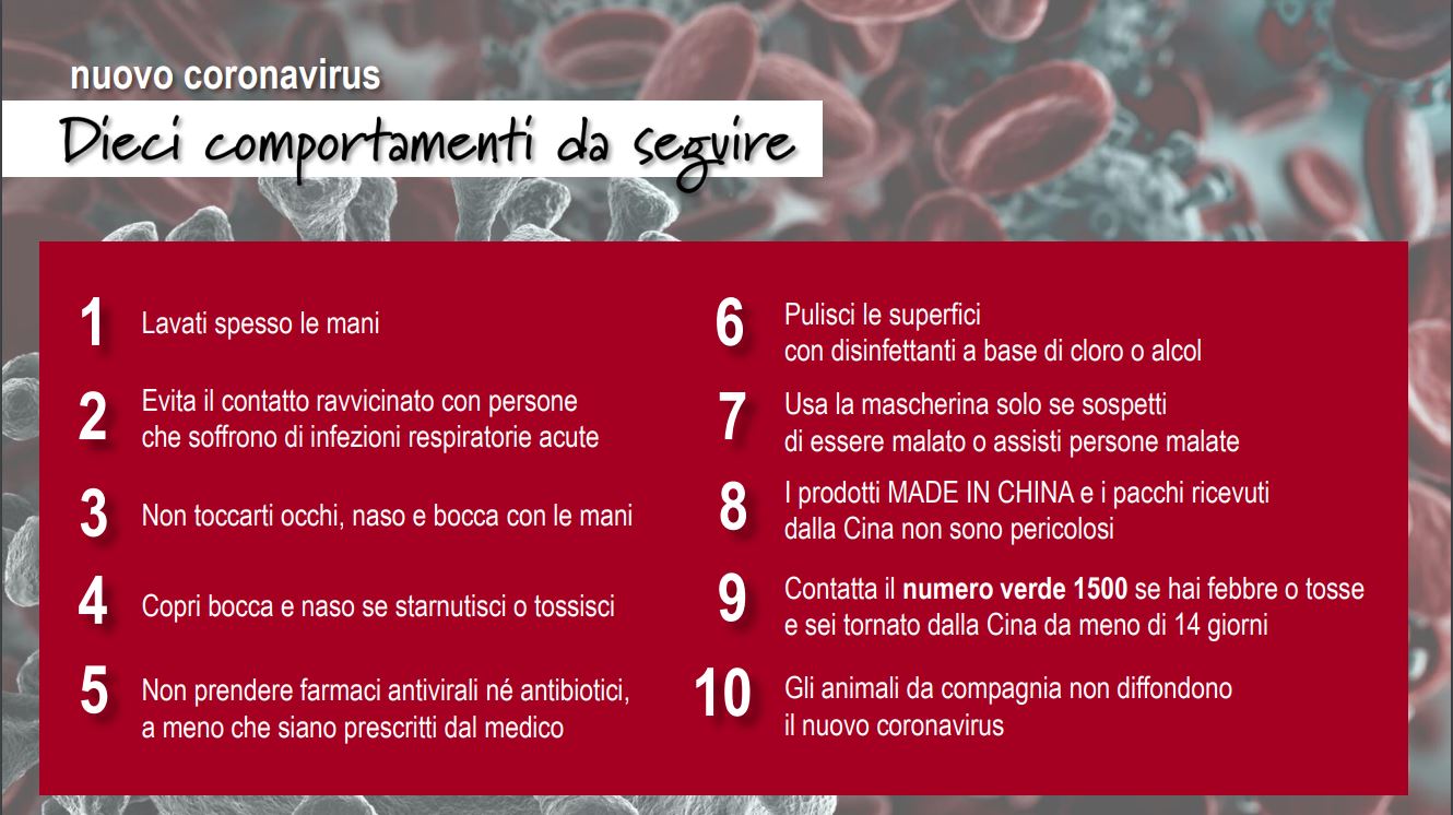 Dieci punti con i comportamenti da tenere in relazione al nuovo Coronavirus rilasciati dal Ministero della Salute e dall’Istituto Superiore della Sanità.