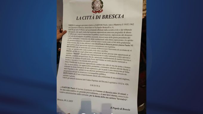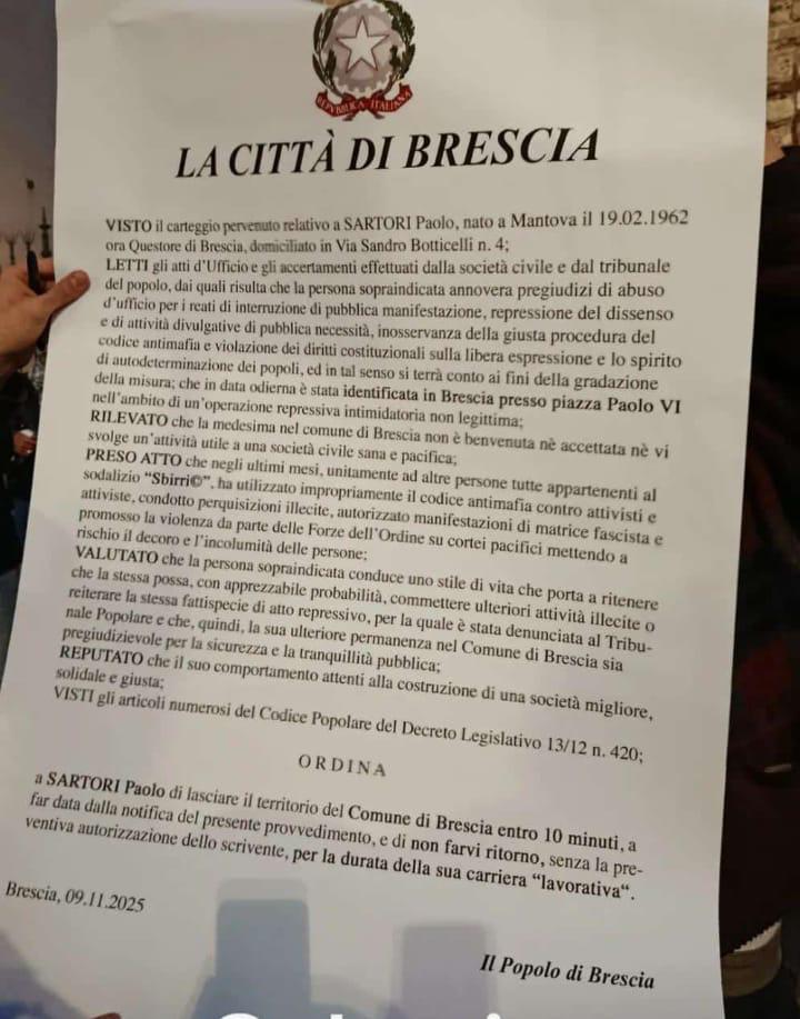 Il documento, modellato graficamente come un provvedimento amministrativo, è stato letto pubblicamente dagli attivisti che ne hanno denunciato il carattere “simbolico” e di risposta alle misure di allontanamento ricevute da alcuni di loro nei mesi scorsi.