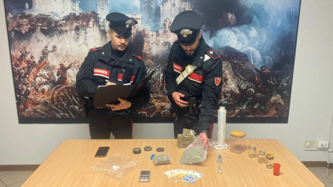 La perquisizione personale ha dato esito positivo e ha portato i militari ad estendere gli accertamenti all’abitazione dell’uomo. All’interno sono stati rinvenuti 5 grammi di cocaina, 40 grammi di hashish e 157 grammi di marijuana, oltre a denaro contante, bilancini di precisione e materiale per il confezionamento.