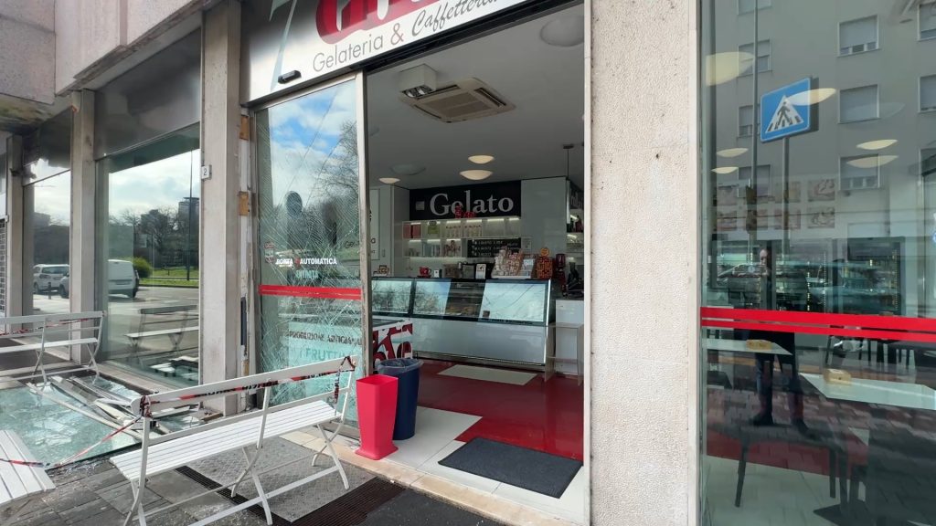 Poco prima della mezzanotte una Panda ingrana la retro, sfonda la vetrina della Gelateria 7° Gelo di via Corsica a Brescia e fugge. Ingentissimi i danni, l’intera vetrata (antisfondamento) crolla. L’auto viene ripresa mentre si allontana a tutta velocità.