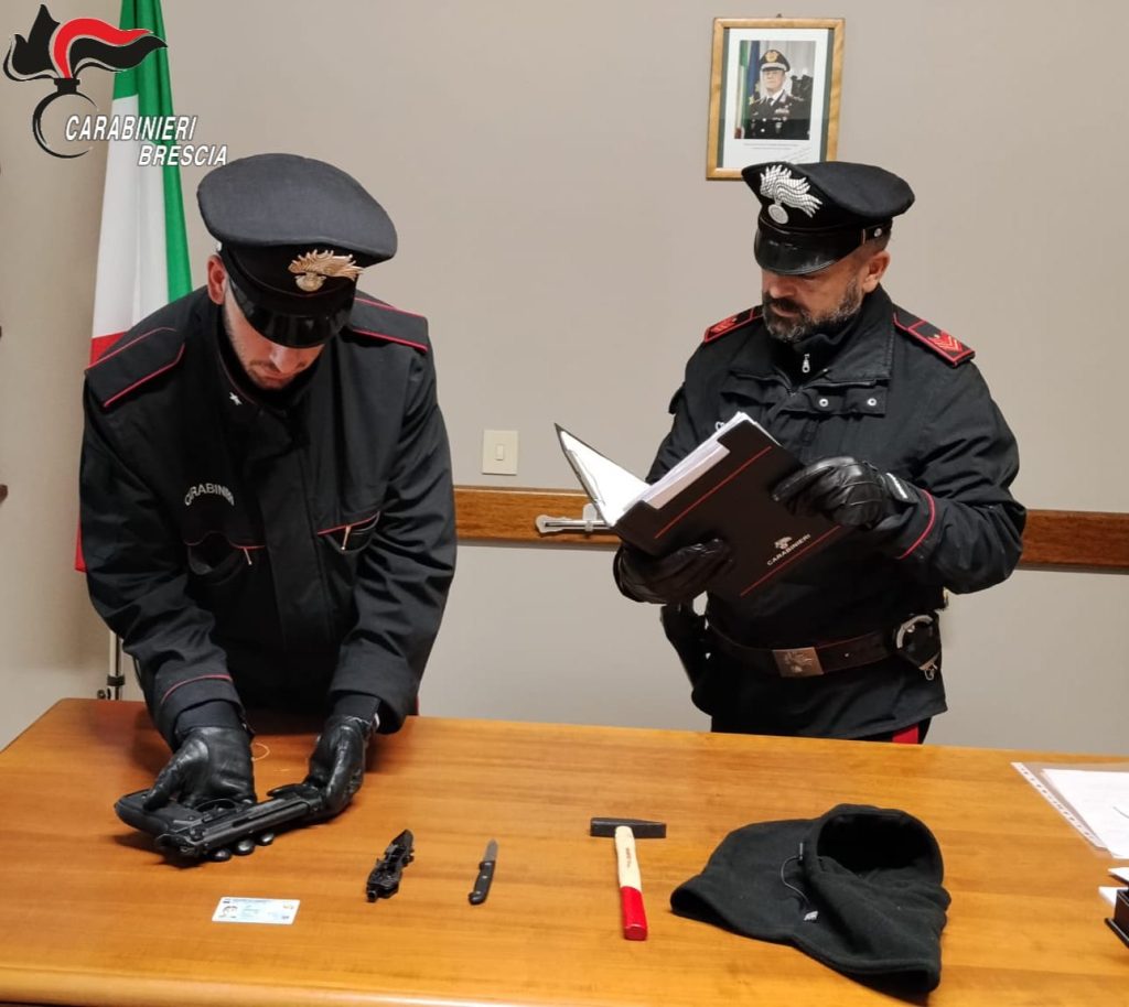 A quel punto sono scattate le ricerche e in breve tempo i Carabinieri di Verolanuova hanno rintracciato l’utilitaria descritta, trovando pistola, passamontagna e martello, oltre a due coltelli a serramanico.
