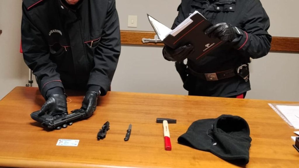 A quel punto sono scattate le ricerche e in breve tempo i Carabinieri di Verolanuova hanno rintracciato l’utilitaria descritta, trovando pistola, passamontagna e martello, oltre a due coltelli a serramanico.