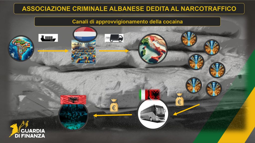 Secondo gli inquirenti, il gruppo criminale – con base direttiva in Albania e ramificazioni stabili anche in Italia come le basi logistiche di Rovato e Palazzolo – avrebbe importato in Europa oltre 1.300 kg di cocaina, provenienti dal Sud America e trasportata via mare verso i principali porti dell’Europa del Nord. La droga veniva poi trasferita su gomma fino in Italia, nascosta e camuffata sui mezzi pesanti. Una volta nel territorio nazionale, gli stupefacenti sarebbero stati smistati in sei basi logistiche distribuite in modo strategico lungo la Penisola, dove venivano gestite sia la distribuzione delle partite di droga, sia la raccolta dei guadagni in contanti. Il denaro ricavato dal narcotraffico veniva poi trasferito ai vertici dell’organizzazione tramite money mules, spesso autisti compiacenti di autobus passeggeri sulla tratta Italia- Albania, incaricati di movimentare grosse quantità di contante.