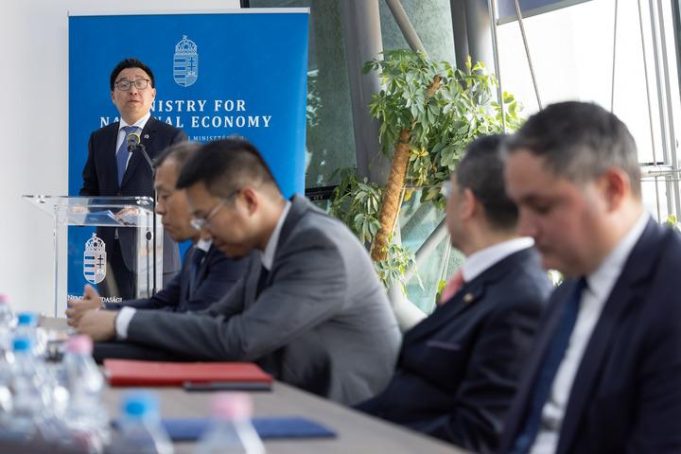 Zhang Hui (dietro), vice presidente del NIO Group, interviene durante una cerimonia di firma a Budapest, in Ungheria, ieri 21 maggio 2024. La cinese NIO, azienda leader a livello mondiale nel settore dei veicoli elettrici (EV) intelligenti, ieri nella città ha annunciato una partnership strategica con la Istvan Szechenyi University Foundation ungherese. (Xin)
